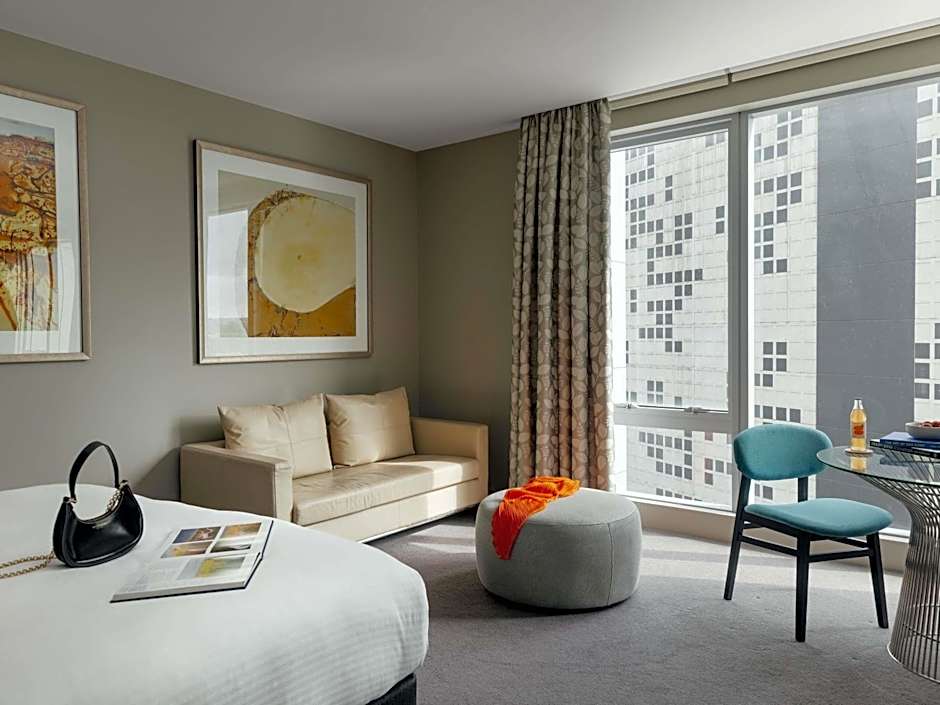This suite offers city skyline views from its private balcony, a modern kitchen and two separate bedrooms with private bathrooms.